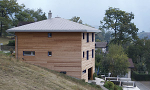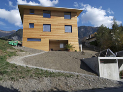 Holzelementbau,welcher in einer in den Hang gebauten Betonwanne